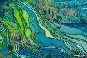 Così come le condizioni atmosferiche e il clima, anche gli scenari cambiano a seconda del luogo in cui vi trovate: ripercorrendo la mappa con un dito, partendo da nord-est e procedendo verso sud, la vasta pianura mancese cede il passo all'area desertica dello Xinjiang, che a sua volta lascia posto alle steppe della Mongolia Interna, all'altopiano del Loess, alla valle del Fiume Azzurro, alle colline del Sichuan, alle catene montuose del Tibet, alle foreste pluviali dello Yunnan e così via verso le spiagge assolate e le isole tropicali.